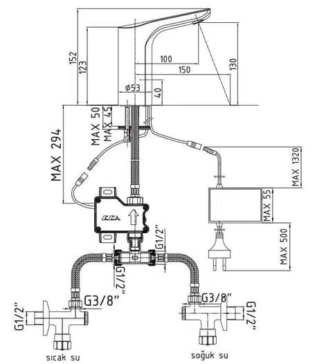 Çıkış Ucu Uzunluğu 100 mm'dir.Çıkış Ucu Yüksekliği 130 mm'dir.Çift Su Girişlidir. ( T adapptörü ile )220 V Güç Kaynağı İle ÇalışırFiltreli ara musluklar ürünle birlikte verilmektedir3 Bar Basınçta Su Akış Miktarı Dakikada Maksimum 5 Lt "ST"'li Kodlarda İse Dakikada 5 Lt ' dir.Kireç kırıcılı perlatörYurtiçi Ücretsiz Montaj Hizmeti Verilmektedir.